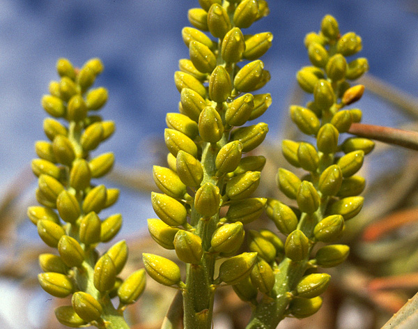 breiten zylindrischen Trauben, die oben spitz zulaufen. Die 3 cm langen Blüten sind schmal und röhrenförmigen.