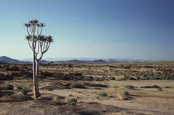 Köcherbaum wächst meist in Felsenlandschaft. Das Gestein erwärmt sich während des Tages und gibt nachts