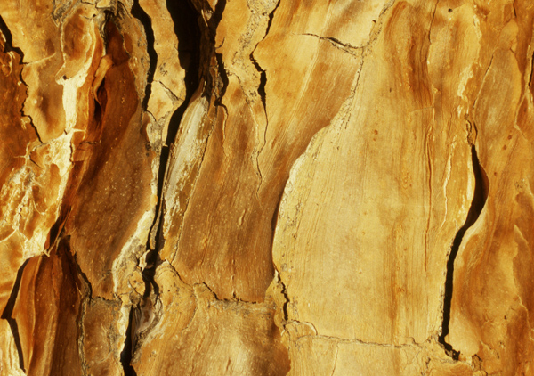 Die Rinde des Stammes ist ocker-/ goldfarben und rissig; es sieht aus, als würde sich der Stamm schuppen.